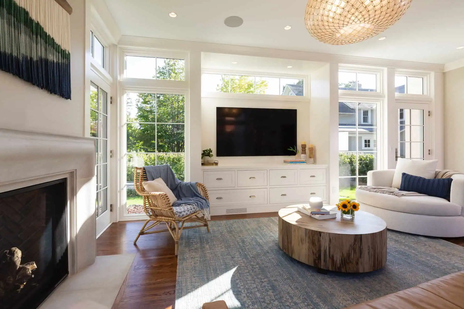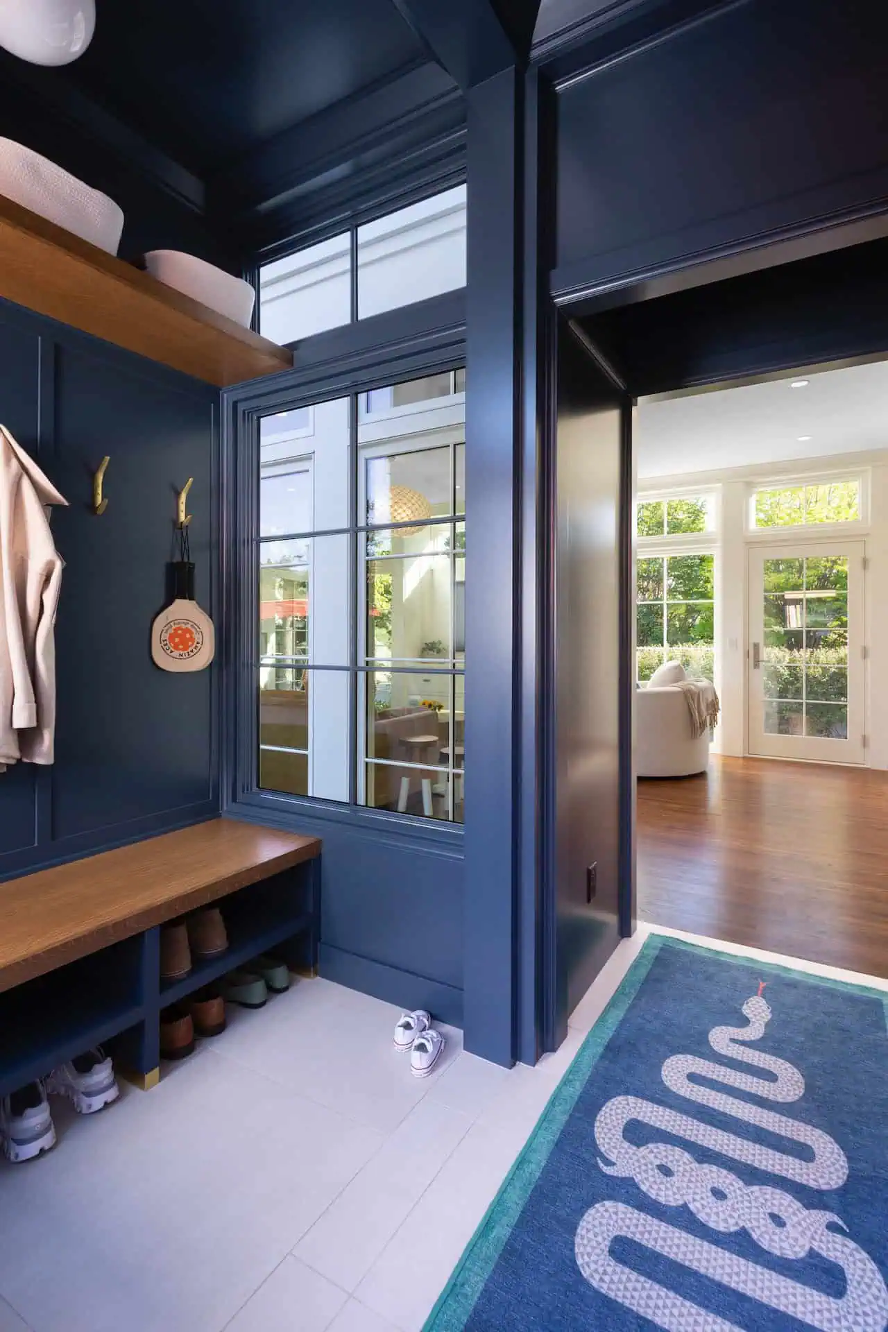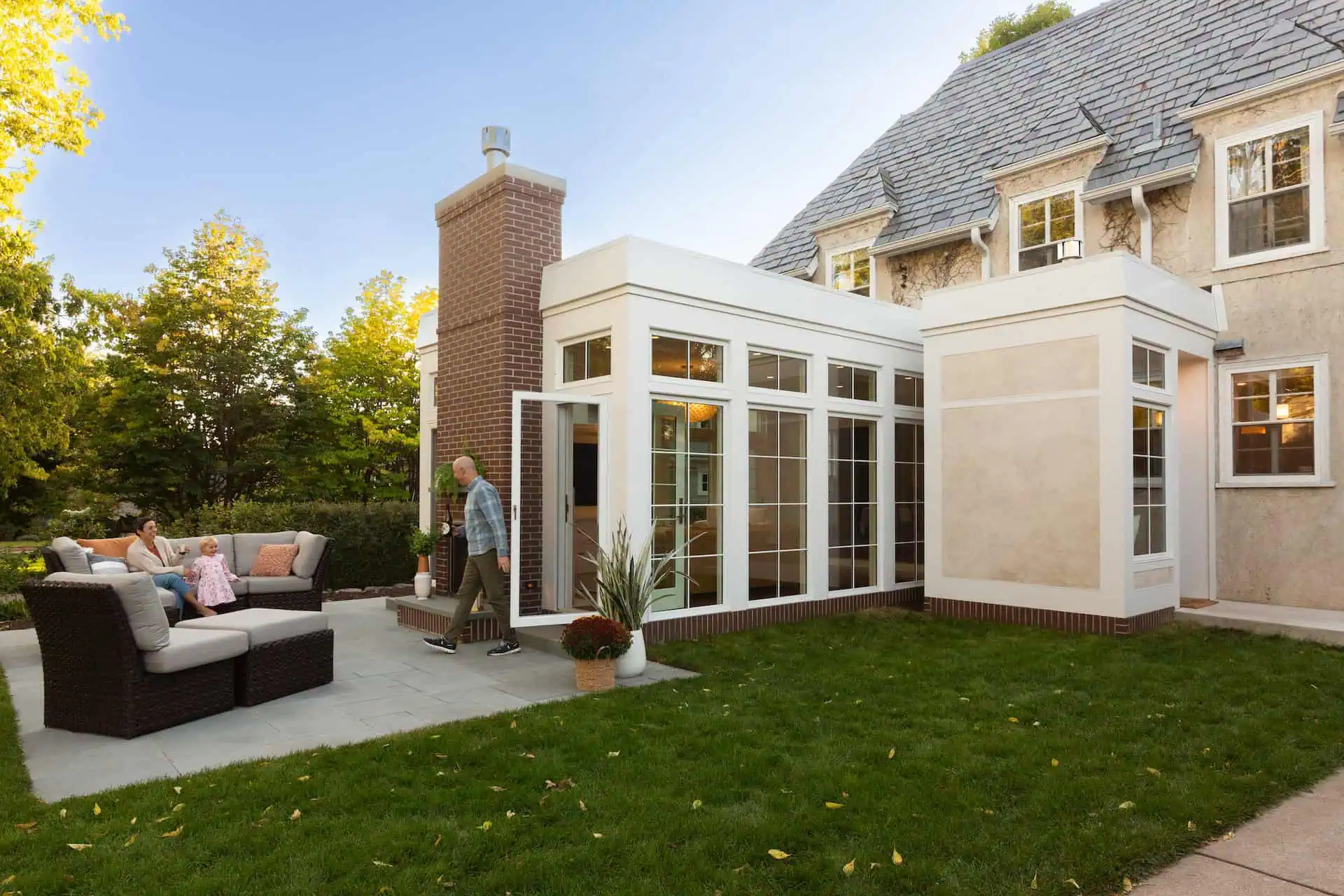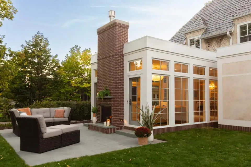With careful planning and attention to the original essence of the home, this well-balanced and thoughtful addition brings the outdoors in. The artful and open sunroom serves as the centerpiece of this family’s home. It seamlessly integrates with the existing structure, mirroring the paneling, windows, and intricate trim work found throughout the house. Every detail has been considered to ensure a harmonious blend between the old and the new. A practical and welcoming mudroom creates a necessary space for the family to pause on their way in the door, adding a layer of convenience to daily life, and proving that thoughtful design can enhance both the aesthetic and functionality of a living space. One of the standout features is the indoor/outdoor fireplace. This unique addition allows residents to enjoy the warmth and coziness of a fireplace while simultaneously connecting with the natural surroundings.