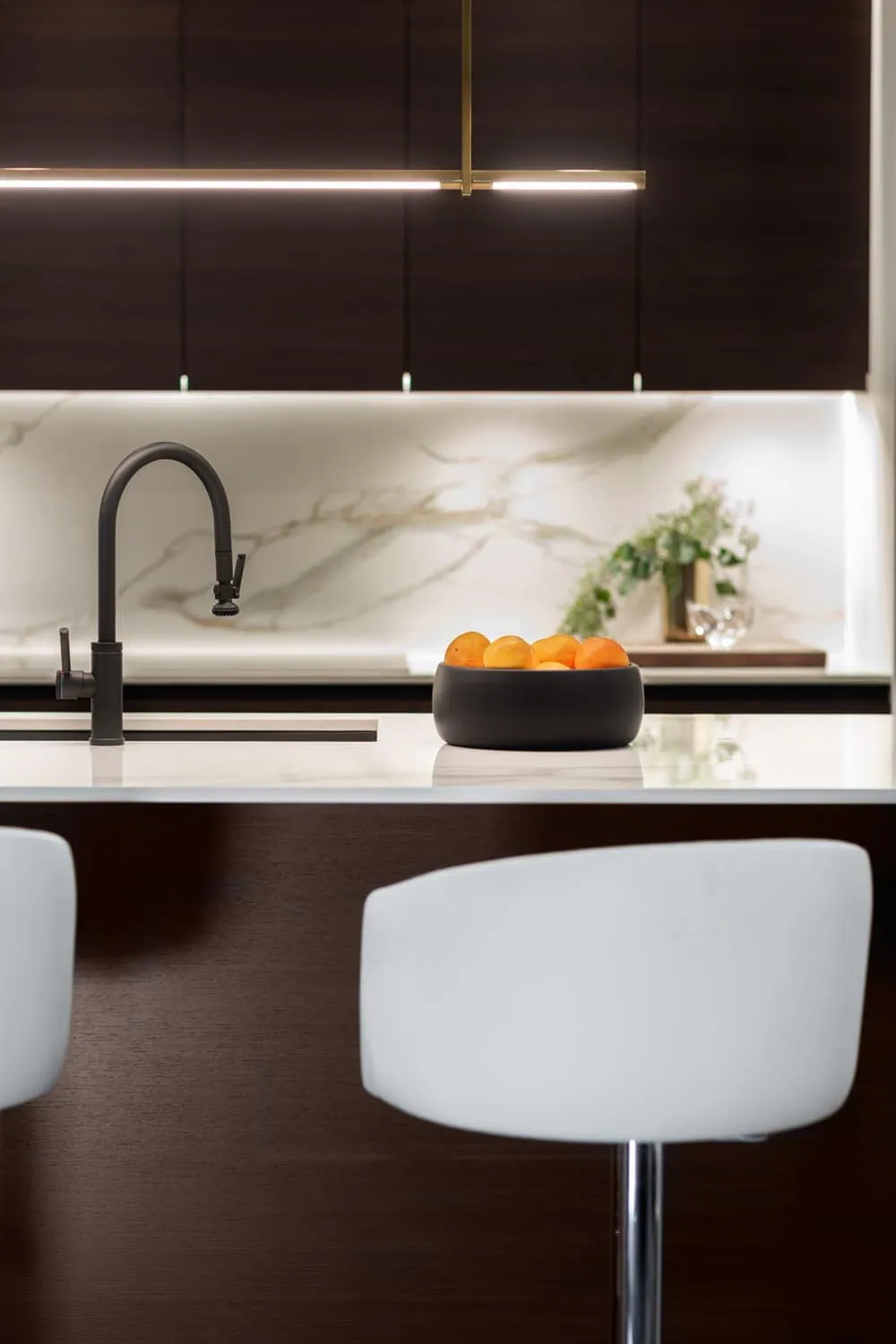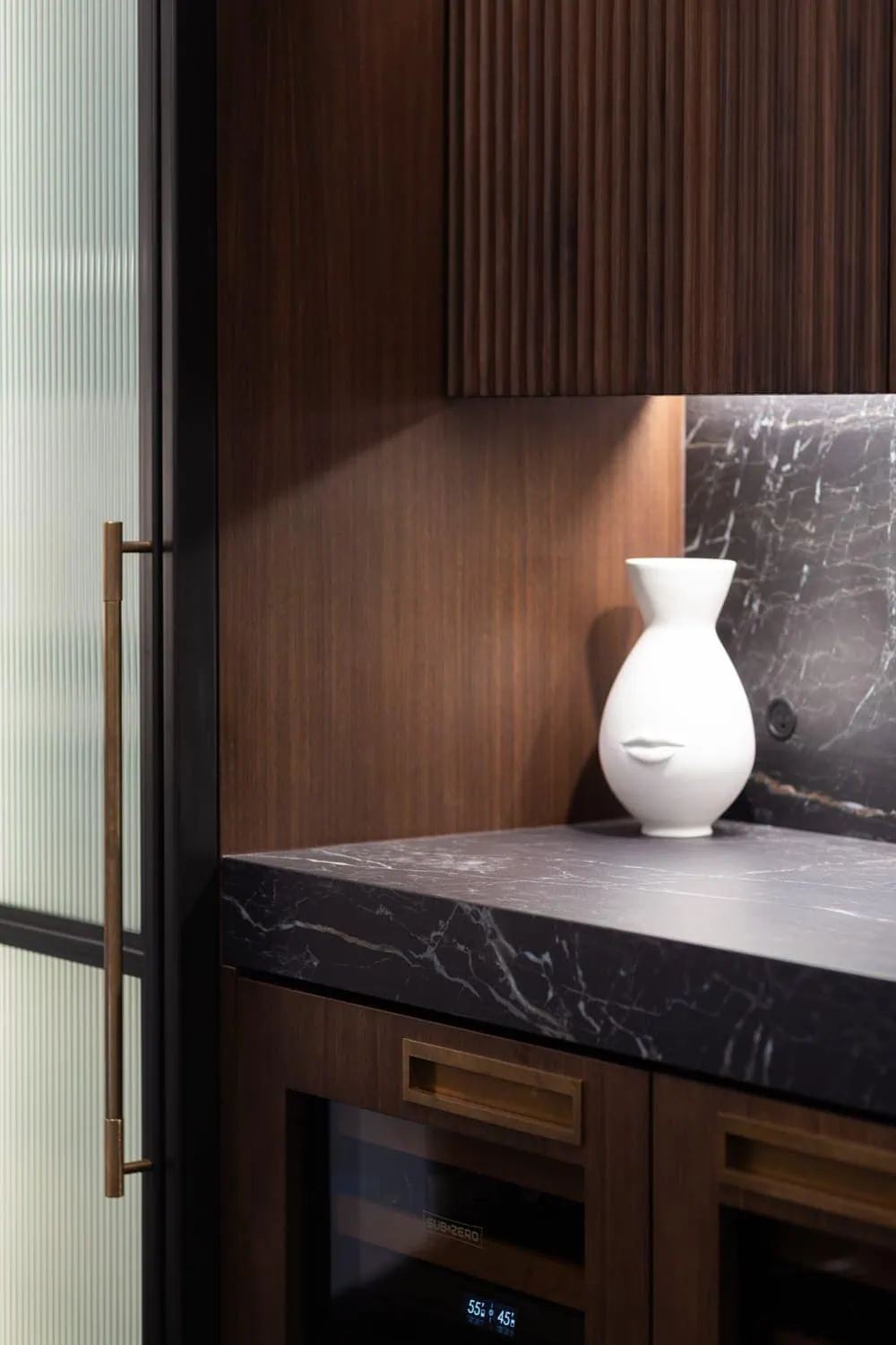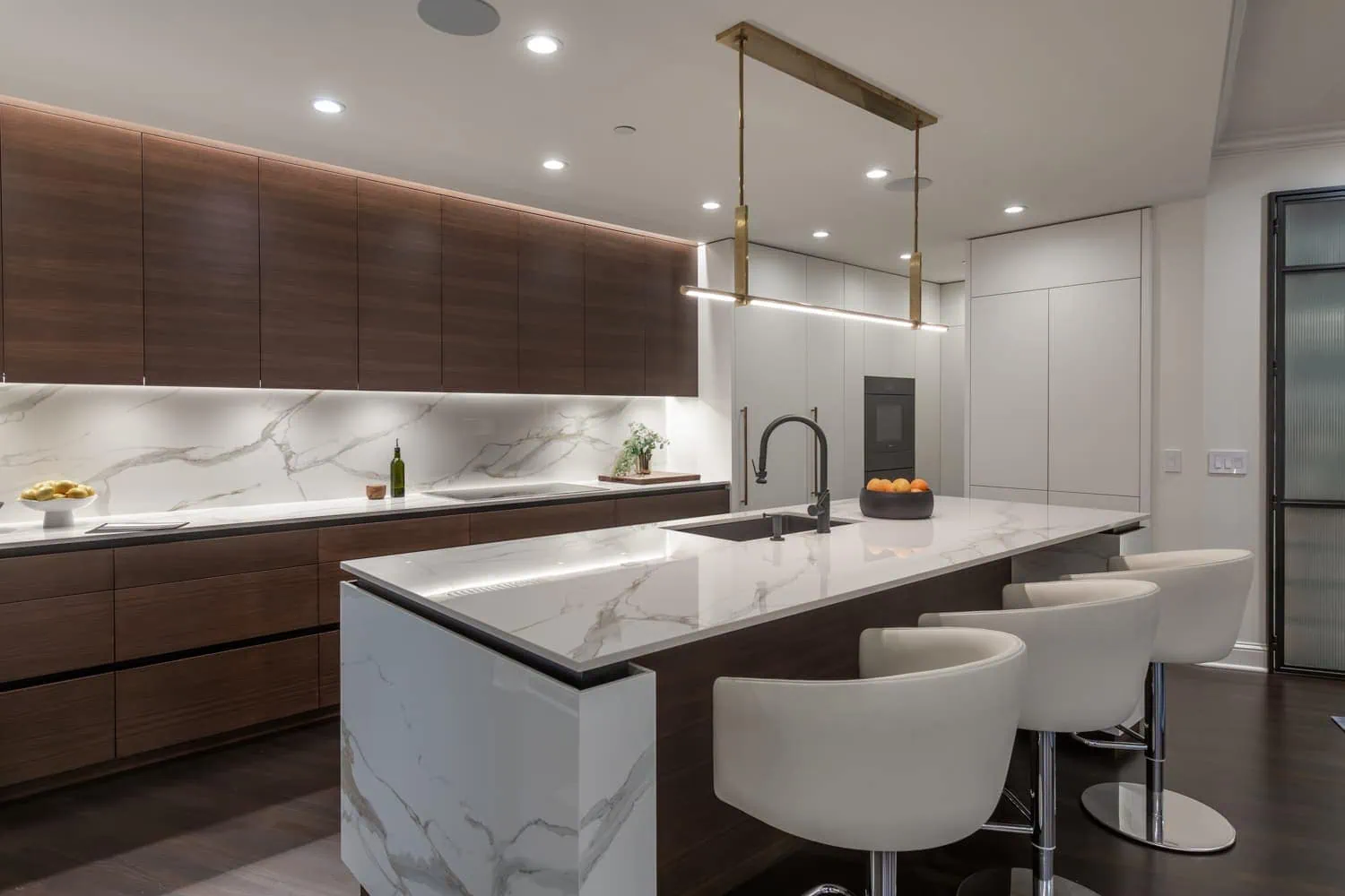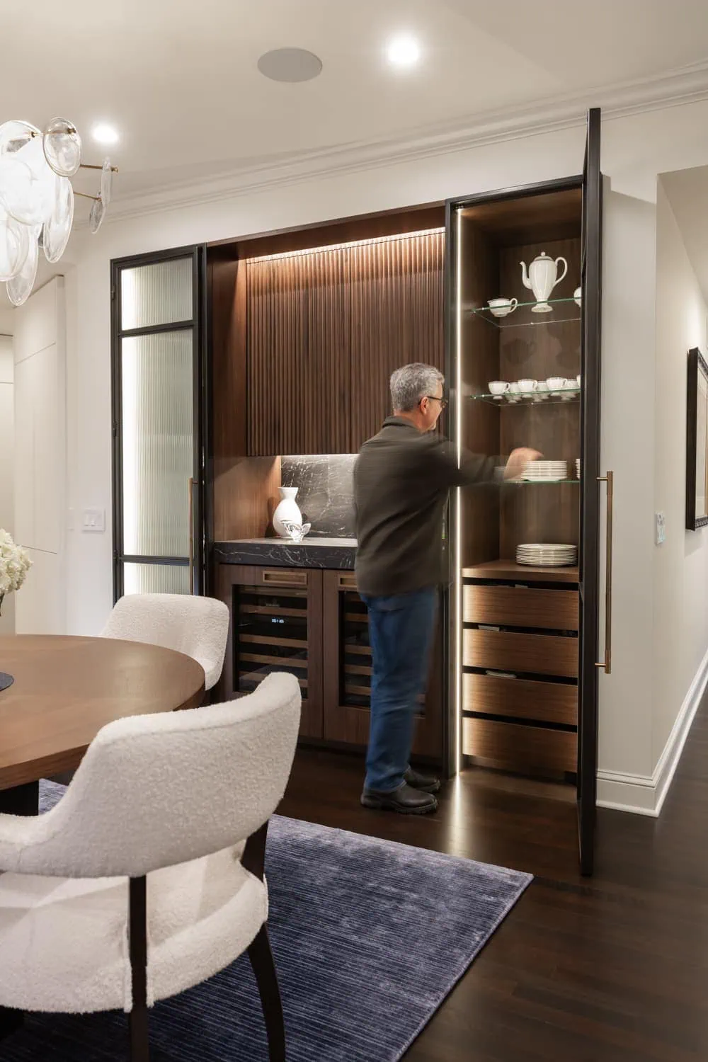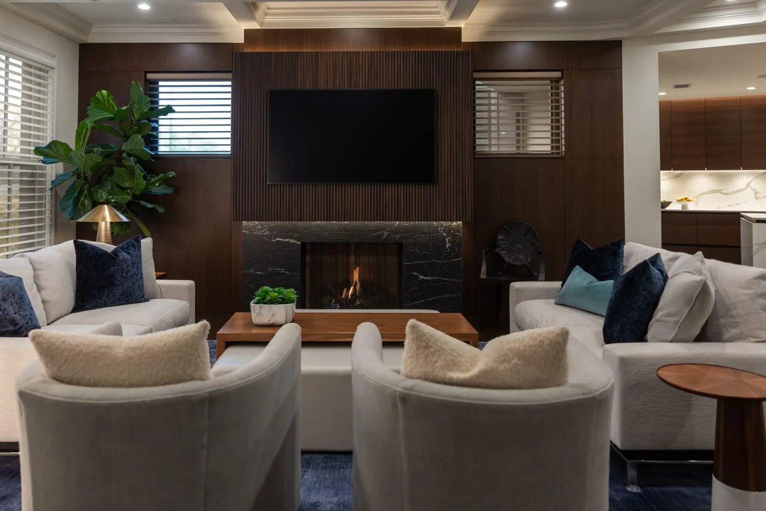 The transformation included a new kitchen featuring a spacious Calacatta porcelain island, modern appliances, and custom cabinetry. The bar was elevated with bespoke walnut cabinetry and elegant fluted glass panels. The fireplace was redesigned to blend style and function, becoming a striking focal point for gatherings. The result is a sophisticated, modern aesthetic that reflects the homeowners’ desire for entertaining while maintaining a deep connection to the neighborhood they love.