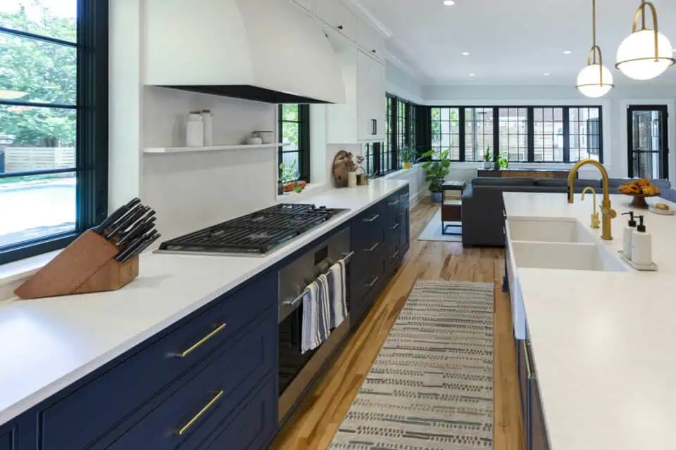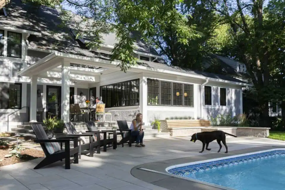 This home had a spacious lot with a pool, but the views and circulation were lacking. Our homeowners were eager to have a welcoming space to entertain their family and friends. We built an addition that extends to the back and side of the home creating space for a large kitchen, cozy dinette, and an inviting family room. The homeowners wanted to make the most of their backyard, so we built wall-to-wall windows letting in plenty of natural light and stunning views. We transformed the old, dimly lit kitchen into a versatile space, now serving as a convenient powder room, a handy pantry, and a practical mudroom entry. This project won a national Chrysalis home addition award in 2023 and a 2023 Remodeler of Merit Award.