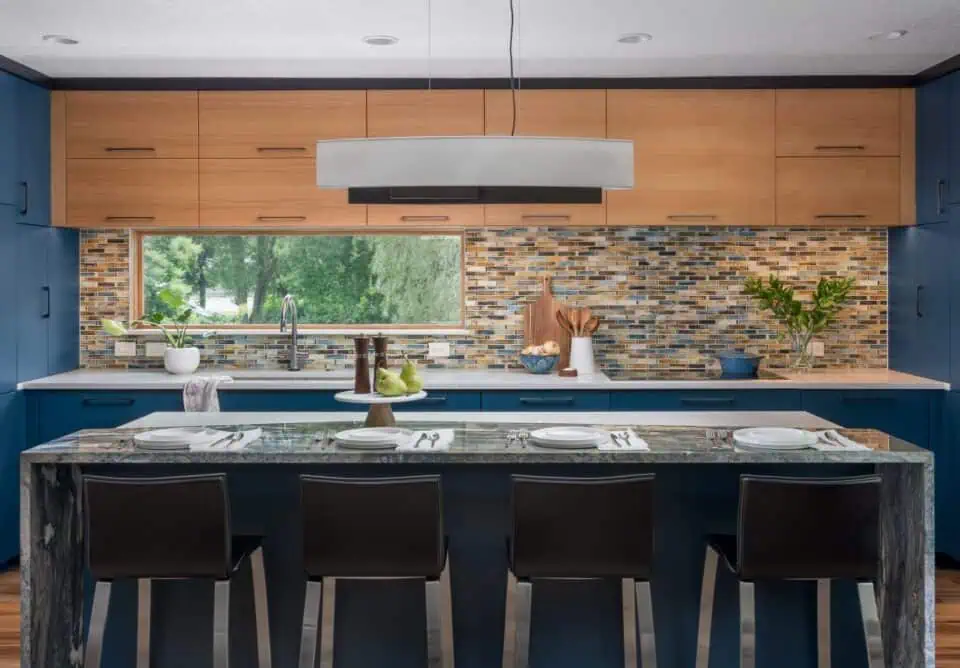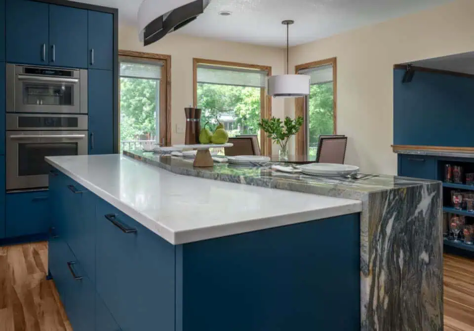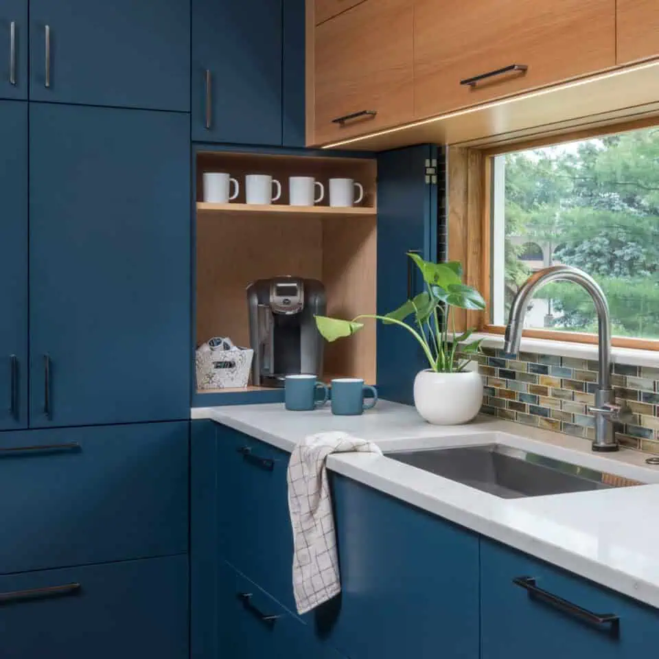 This 1970’s split level in Golden Valley was brought up to date with a dramatic kitchen addition. Family vacations to Hawaii were the sentimental inspiration for these bold blue cabinets with sand and sea-water colored mosaic backsplash tile. A long, low horizontal window over the kitchen sink provides views to the homeowner’s English garden. Mixed contrasting countertop materials create interest and define space between food preparation and meal service. An open appliance garage / beverage center provides a convenient space for a coffee station while keeping countertop clutter from view.