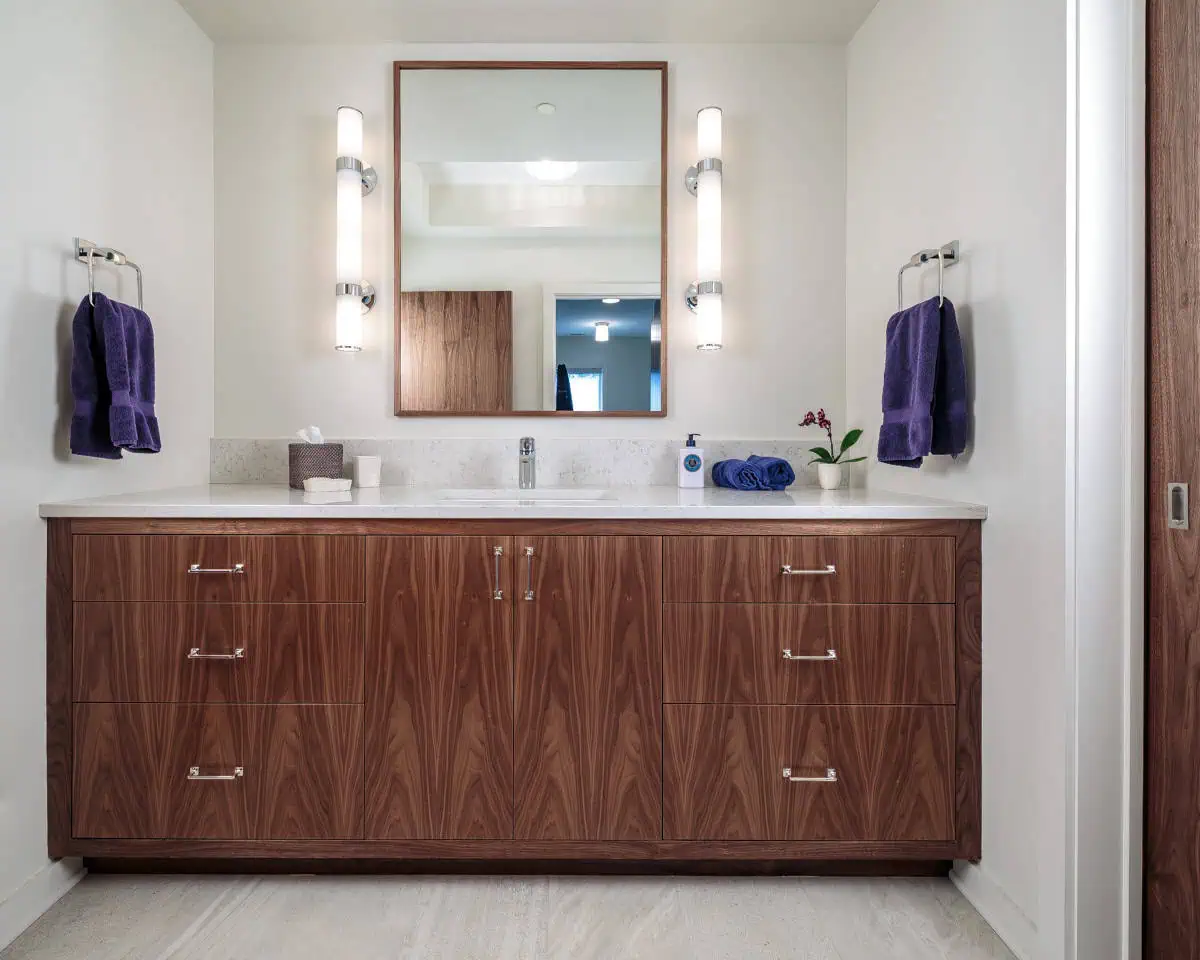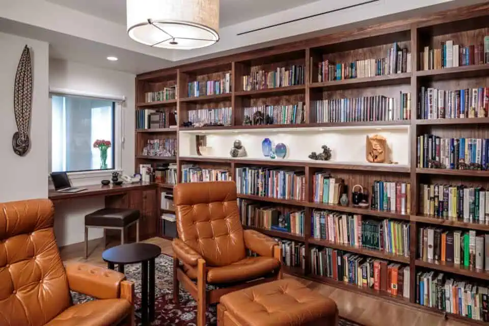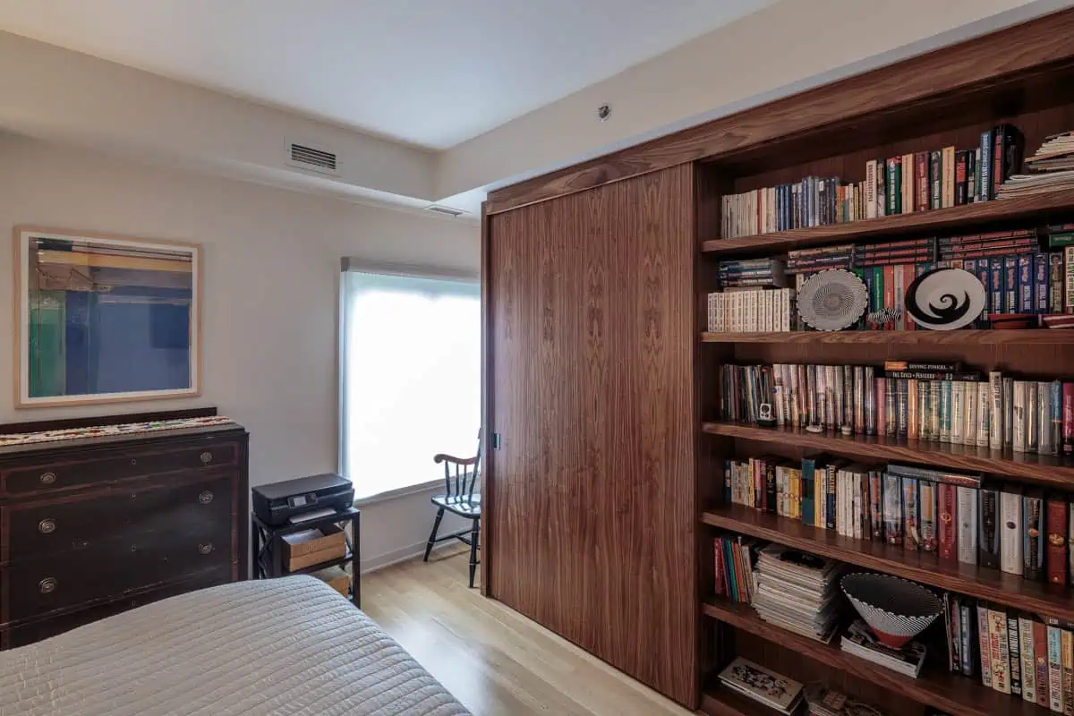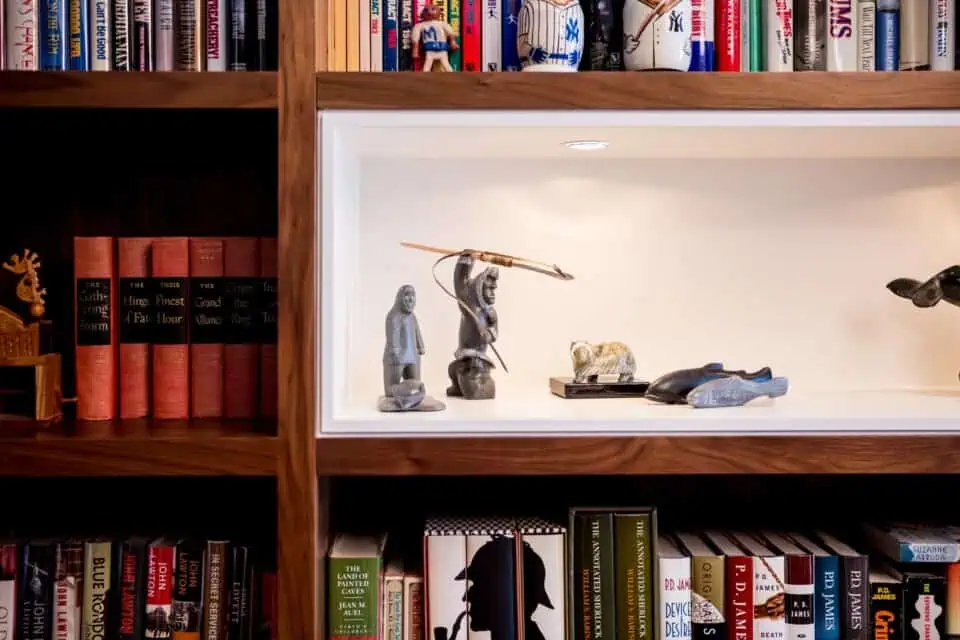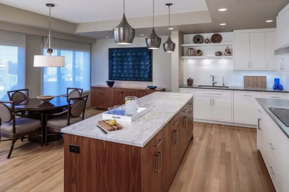 In collaboration with Brooke Voss Interior Design, this challenging space became the perfect kitchen for entertaining. By removing a second staircase that opened up into the kitchen, we were able to create enough space for two kitchen islandsโone dedicated to cooking and the second for happy hour and hanging out. A custom-built free-standing furniture buffet and open shelving keep the narrow space feeling light and bright.