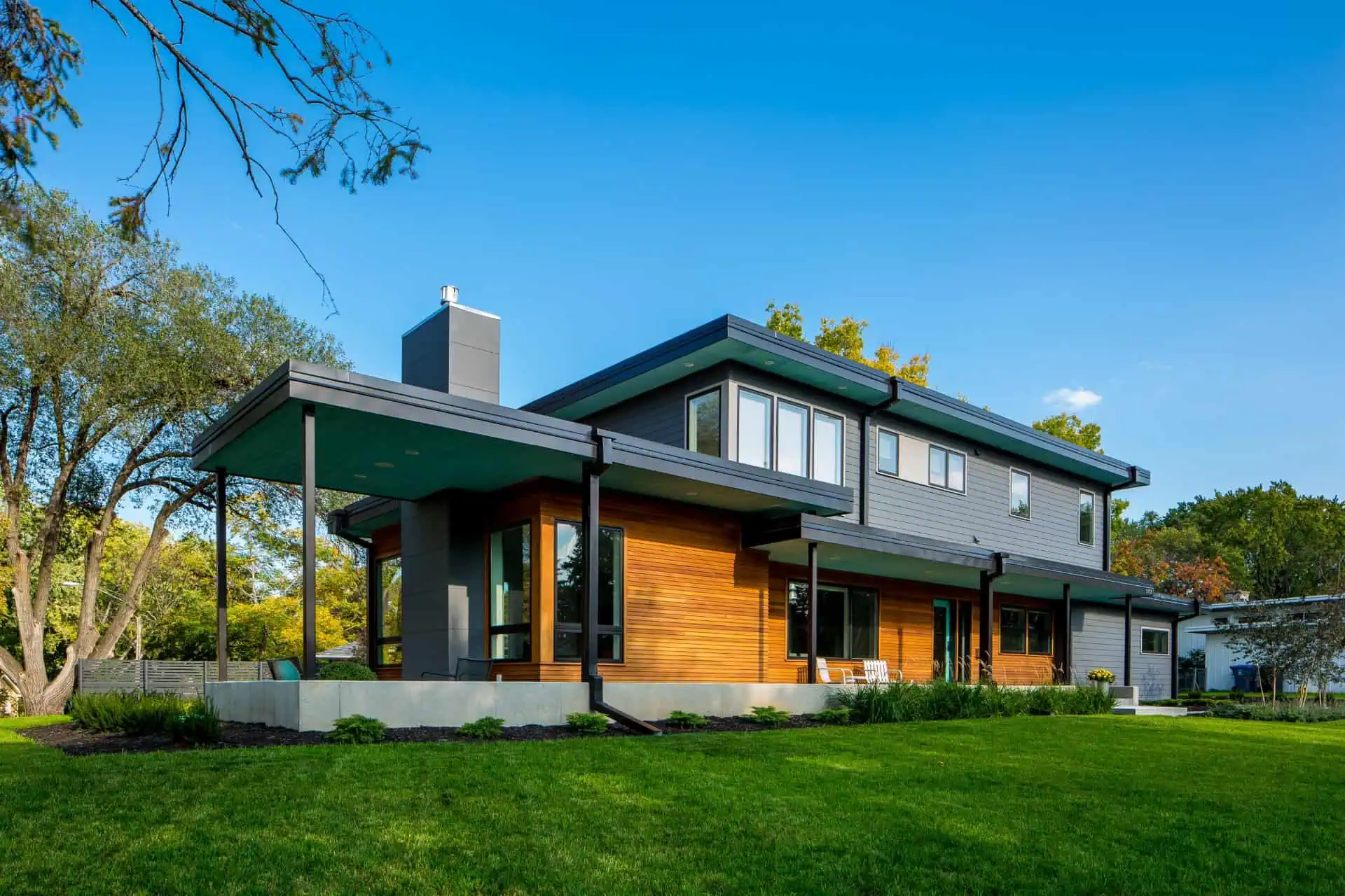 With the existing home in disrepair, the homeowners came to Quartersawn to help them design and build a new home to honor the architecture of their unique neighborhood. Looking at New Prairie School architecture as a guide, this modern home was designed with flat roofs, broad overhanging eaves, and an open floor plan that emphasizes natural materials.