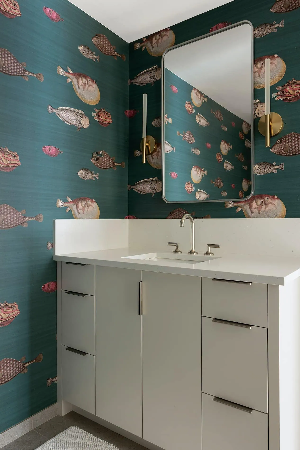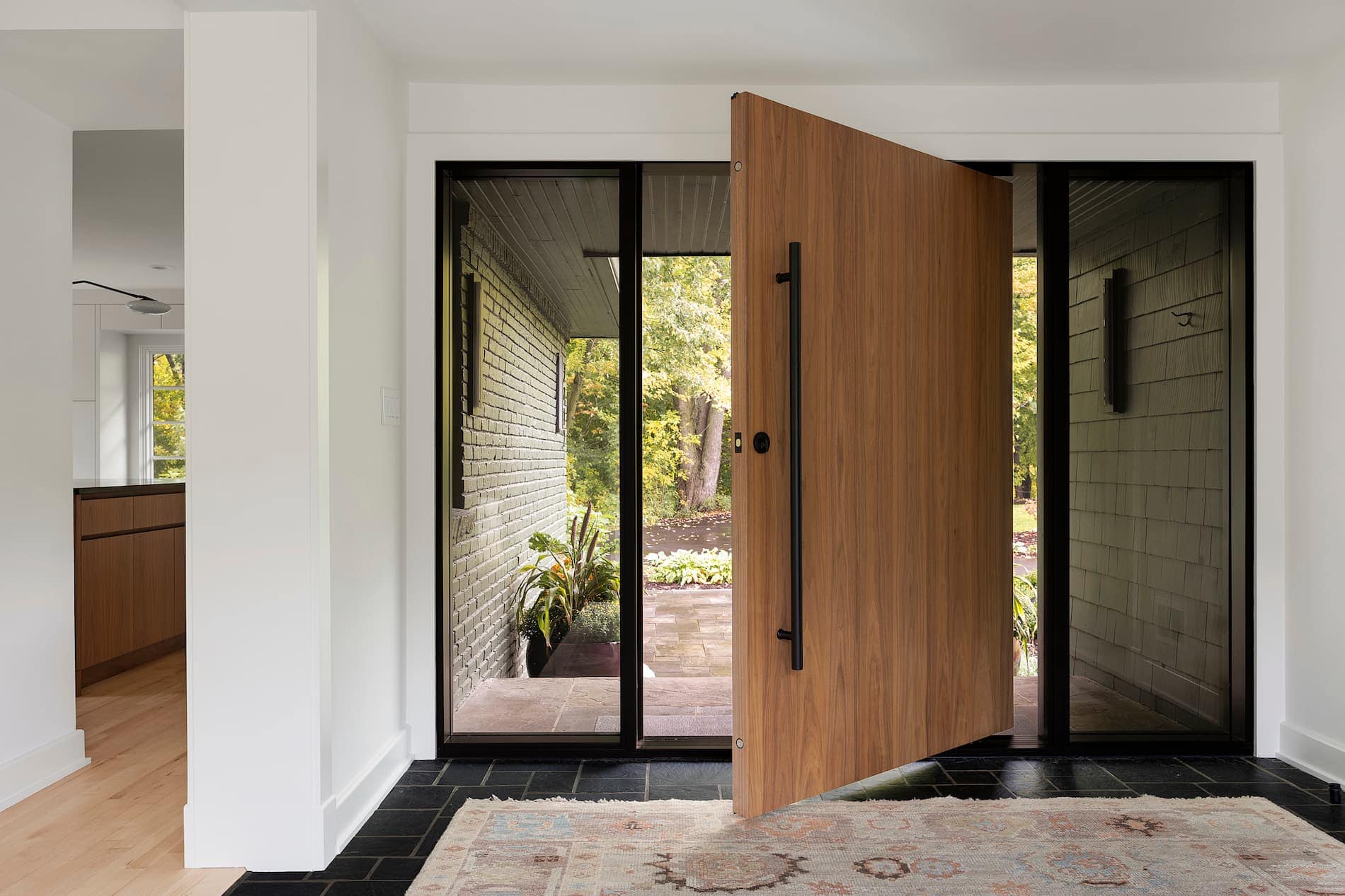 At the heart of the home, a walnut island and custom cabinetry redefine the kitchen as a place for gathering and connection. The reimagined primary suite offers a tranquil bath with artisanal materials and custom details. A sculptural fireplace and steel stair rail enhance the living room, while the renewed lower level, once dark and dated, now serves as a moody and graceful extension of the home. Layered with natural materials, curated wallpaper, and meaningful design moments, this renovation is more than a remodel—it’s a modern retreat rooted in craftsmanship and lived-in beauty.
