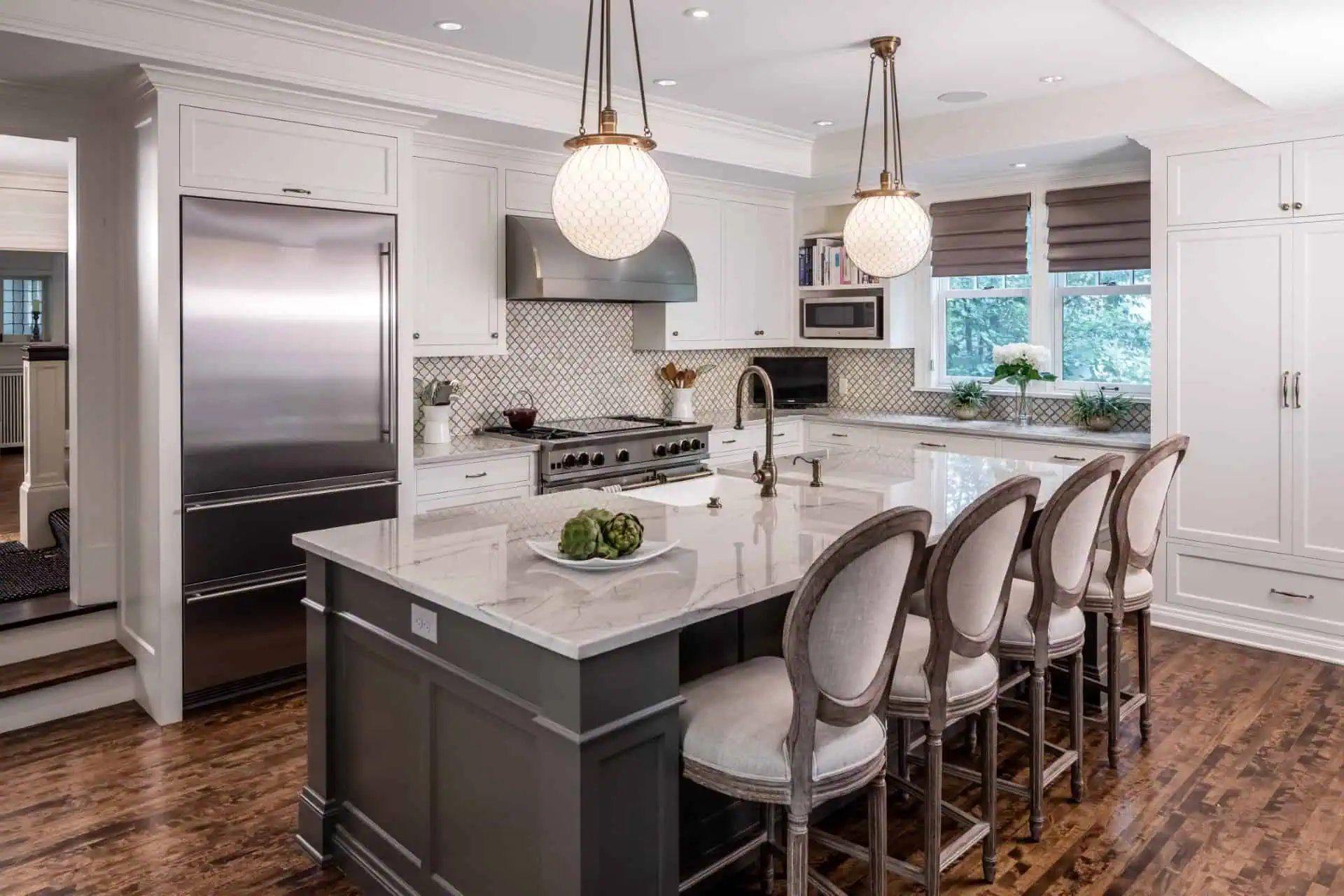This charming 1909 tudor style home within walking distance from Lake of the Isles was updated and reconfigured to meet the needs of a growing family. By removing a secondary rear staircase that entered into the kitchen, we were able to create a large center island and breakfast nook with built-in bench seating. Now the family has plenty of space for dining, schoolwork, and family activities. This beautifully detailed kitchen features an arabesque tile backsplash, Restoration Hardware lighting, and brass accents. Quartersawn utilized space from an existing two car garage to create a new family room.